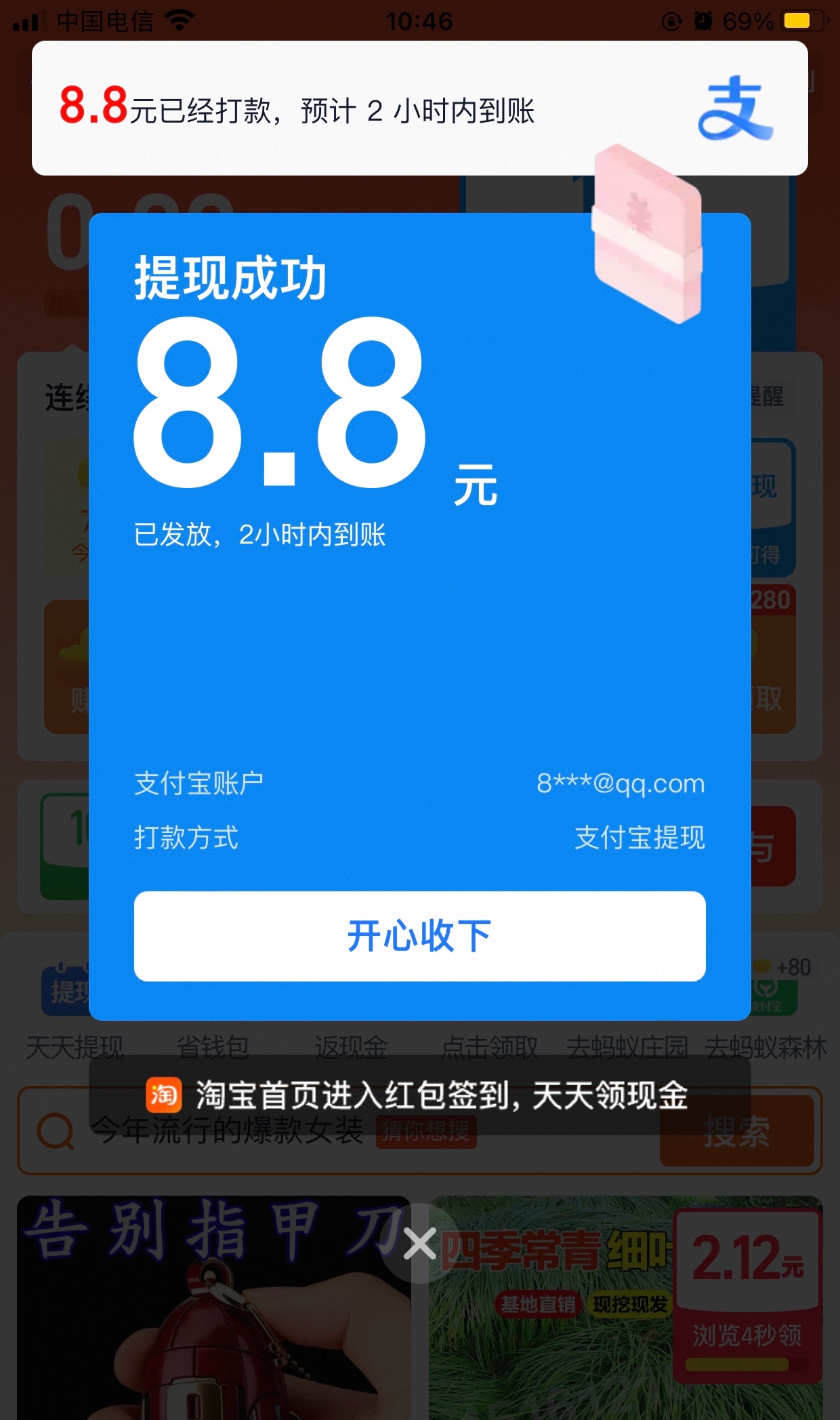 是放水还是因为我是第一个搞 两个号都是8.8 打开淘宝点我的然后下面有个红包签到点进去 一般都是进去自动弹窗然后点一下开就行 抽多少看运气